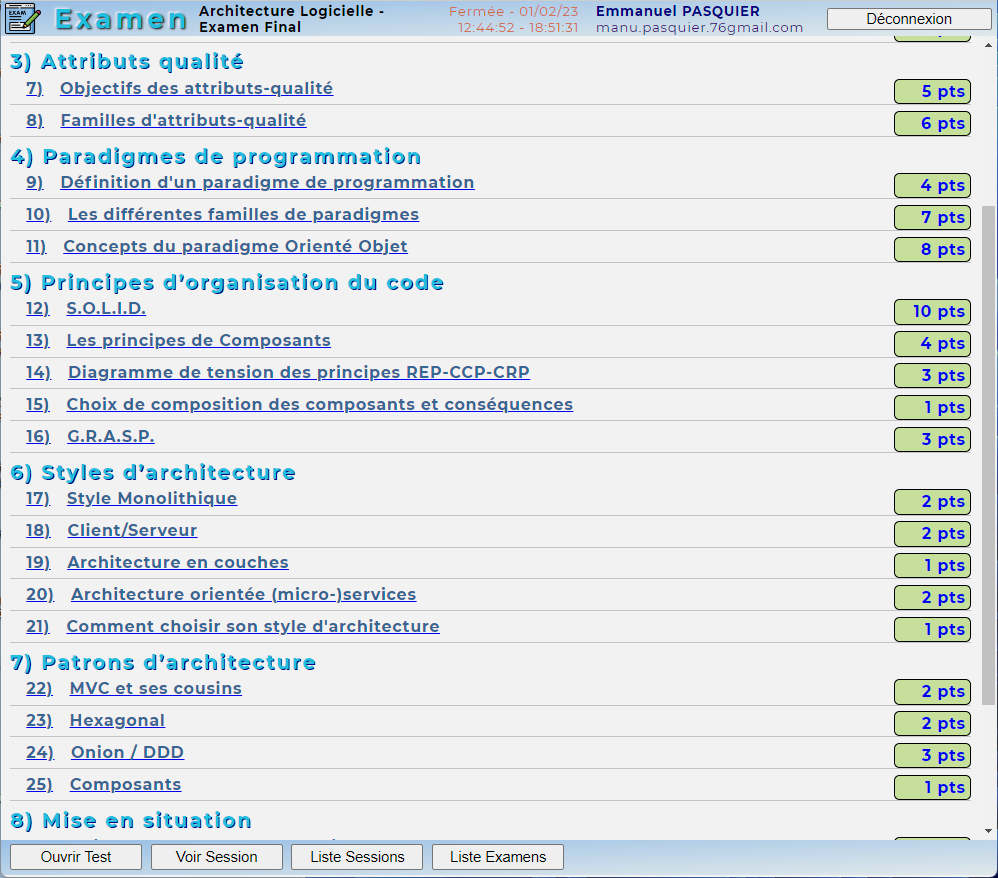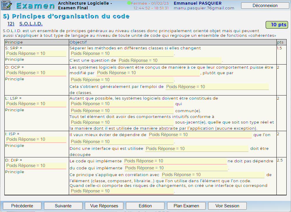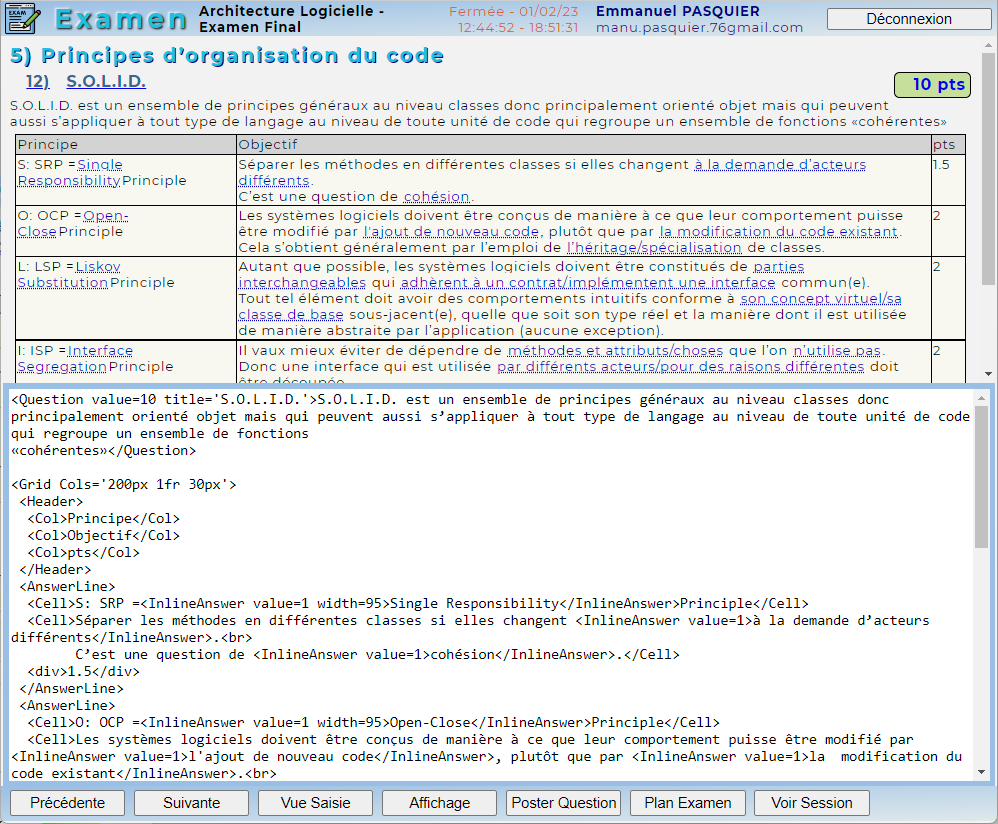 La vue Question est principalement utilisée pendant l'examen C'est le formulaire tel qu'il est remplit par l'étudiant, avec le barème appliqué.