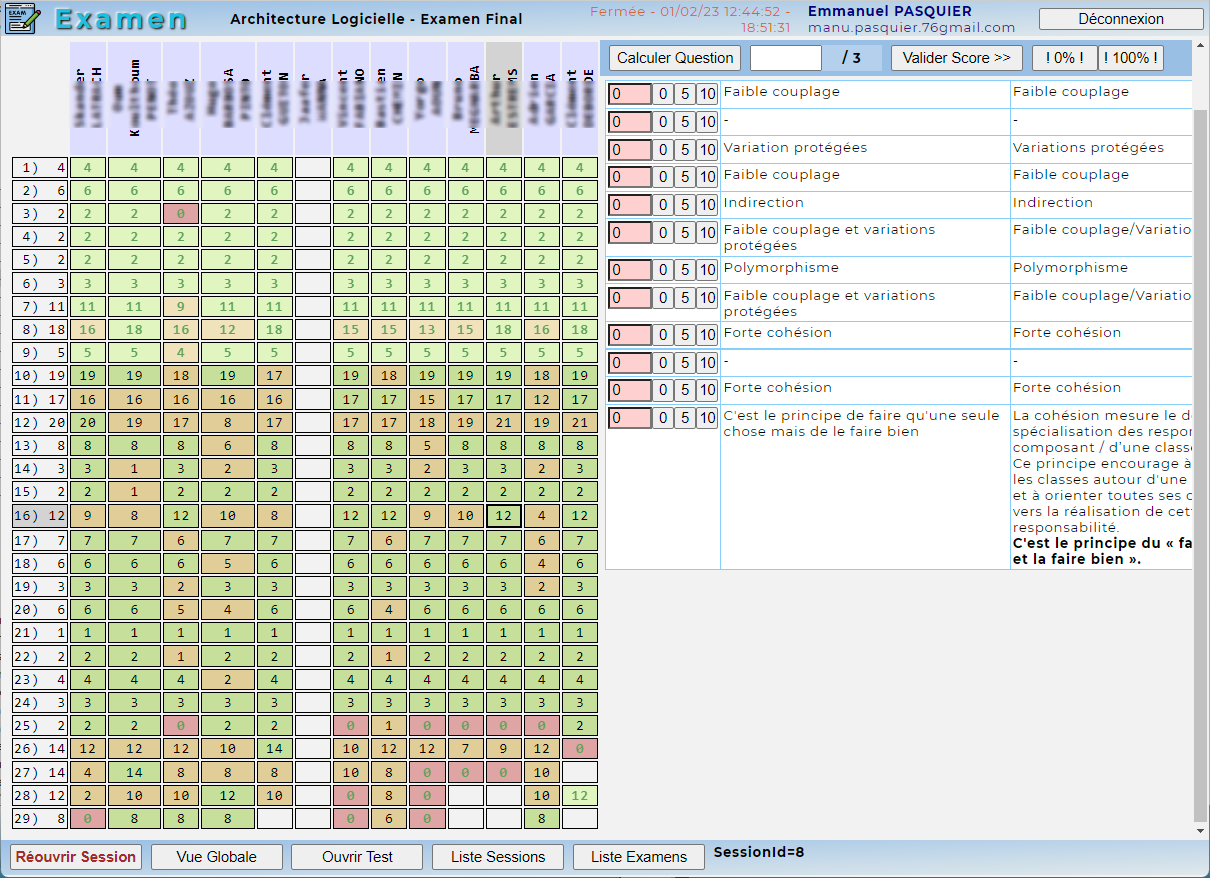 Cette notation, méme sur un questionnaire complexe comme ici (plus de 200 éléments contrôlés) est très rapide grâce à une ergonomie qui permet de rapidement traiter toutes les questions une à une, en affichant les réponses d'un étudiant à côté de la correction